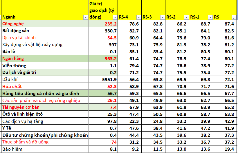 Bảng RS (Sức Mạnh Giá Tương Đối) cho thấy nhóm ngành: Công nghệ, bất động sản, dịch vụ tài chính, xây dựng và vật liệu xây dựng, … đang đứng đầu (dựa trên bảng phân ngành cấp 2 của Fireant). Những cổ phiếu tiêu biểu trong tuần qua của các nhóm ngành trên như: VHM,FPT,AGG,BCM,IDC,TDC, TPB,LPB,MBB…. đang thu hút dòng tiền và là tâm điểm của thị trường.