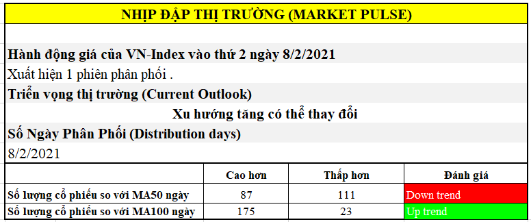 Xu hướng thị trường đã chuyển từ “Xu hướng tăng được xác nhận” sang ” Xu hướng tăng có thể thay đổi”, thị trường xuất hiện 1 phiên phân phối mạnh sau ngày bùng nổ theo đà (FTD) đang cảnh báo xu hướng tăng của thị trường có thể thay đổi. Số lượng cổ phiếu dưới MA50 ngày đang cao hơn số lượng cổ phiếu trên MA50 ngày, trong khi phiên trước đó ngày 5/2/2021 số lượng cổ phiếu trên MA50 ngày đang cao hơn. Đây có xem là cú lật mặt  nhanh hơn lật “bánh tráng”  của thị trường. Điều chúng tôi đang quan sát đến những cổ phiếu đóng cửa dưới MA50 ngày trong phiên 8/2/2021 là có những cổ phiếu có ảnh hưởng lớn đến chỉ số VNIndex như: VIC,VCB,HDB,SAB,NKG,VRE,BVH…. . Điều này đang làm tổn hại đến xu hướng thị trường.