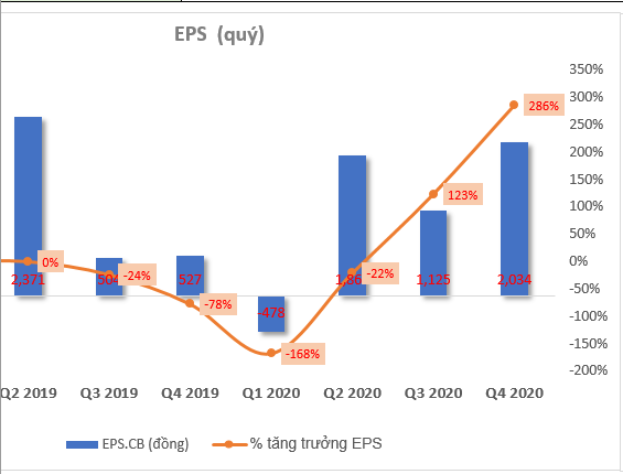 Trong 3 quý gần nhất, LTG đang có mức độ tăng trưởng EPS theo góc 45 độ, điểm nhấn nằm ở cú bức tốc ở quý 4 năm 2020. Trước đó LTG đã có 2 quý làm bàn đạp để bùng nổ mức độ tăng trưởng ở quý 4 năm 2020 với mức tăng hơn 286%.