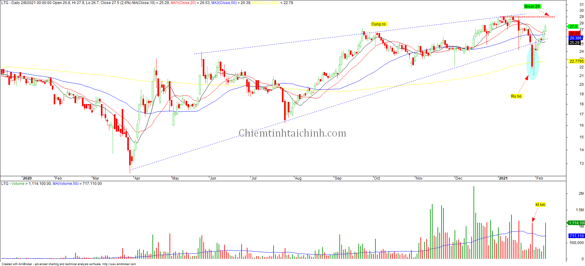 Cổ phiếu LTG sau cú rũ bỏ khá mạnh ở vùng MA200 ngày tương ứng vùng 22.7. Cổ phiếu đang lấy lại được đà tăng, hành động giá tăng mạnh đi kèm với khối lượng lớn trên bình quân 50 phiên đã đưa LTG vào danh sách theo dõi của chúng tôi. Cổ phiếu đang ở vùng “Củng cố” sau một giai đoạn tích lũy hơn 11 tháng tương ứng gần 4 quý, với chất xúc tác đến từ kết quả kinh doanh đang thu hút nhà đầu tư đánh giá lại giá trị cổ phiếu LTG. Cổ phiếu LTG chiếm ưu thế về doanh thu và lợi nhuận so với các doanh nghiệp cùng ngành như TAR, NSC
