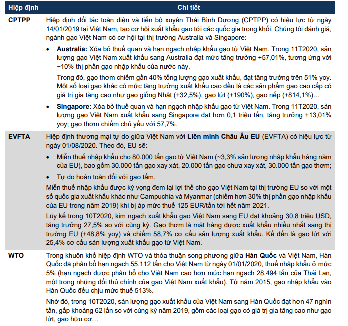 • Giá gạo thế giới tiếp tục ở mức cao, tăng trưởng xuất khẩu ở cả thị trường truyền thống và các thị trường mới, đặc biệt là cơ hội xuất khẩu gạo cao cấp đem lại giá trị gia tăng cao từ các hiệp định thương mại. Bên cạnh các thị trường xuất khẩu truyền thống tại khu vực Châu Á và Châu Phi, ngành gạo Việt Nam đang dần mở rộng xuất khẩu sang các thị trường tiêu dùng gạo cao cấp, gạo đặc sản (gạo thơm, gạo nếp, gạo lứt, gạo hữu cơ…) với giá bán gạo cao hơn từ 20 – 50% so với gạo trắng, kỳ vọng đem lại giá trị gia tăng cho doanh nghiệp và nông dân trồng lúa. Một số hiệp định thương mại với tiềm năng nâng cao giá trị xuất khẩu ngành lúa gạo Việt Nam.