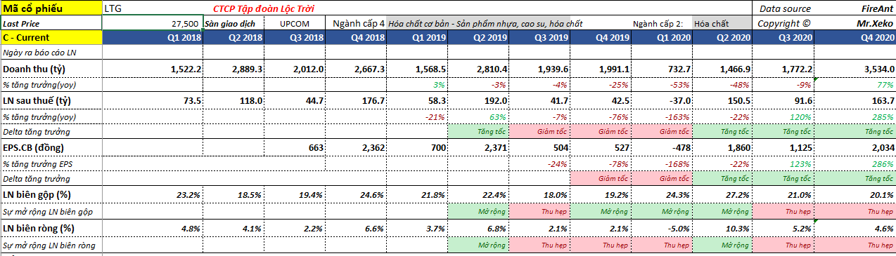 Với kết quả kinh doanh quý 4 vừa mới công bố, doanh số quý 4 của LTG tăng trưởng hơn 77% so với quý 3 năm 2020. Trong khi lợi nhuận sau thuế 3 quý gần nhất đang có sự tăng tốc từ -22 % quý 2 năm 2020  tăng lên 120 % quý 3 năm 2020 và tăng mạnh lên 285% quý 4 năm 2020 . Tuy nhiên biên lợi nhuận gộp của LTG 2 quý gần nhất đang có dấu hiệu thu hẹp, nguyên nhân các khoản chi phí như: Bán hàng, tài chính, quản lý doanh nghiệp tăng trong quý 3 và quý 4 năm 2020.