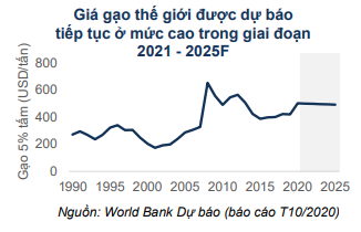Theo dự báo của World Bank, giá gạo thế giới dự báo sẽ bình ổn và khó tăng mạnh trong giai đoạn 2021 – 2024F do nguồn cung gạo tại các quốc gia sản xuất lúa gạo chính tại khu vực Châu Á tăng trưởng nhờ điều kiện thời tiết thuận lợi hơn trong năm 2021. Giá gạo được kỳ vọng tiếp tục ở mức giá cao, khoảng 490 – 500 USD/tấn đối với gạo 5% tấm, cao hơn 22.7% so với mức giá thấp trong giai đoạn 2015 – 2019.