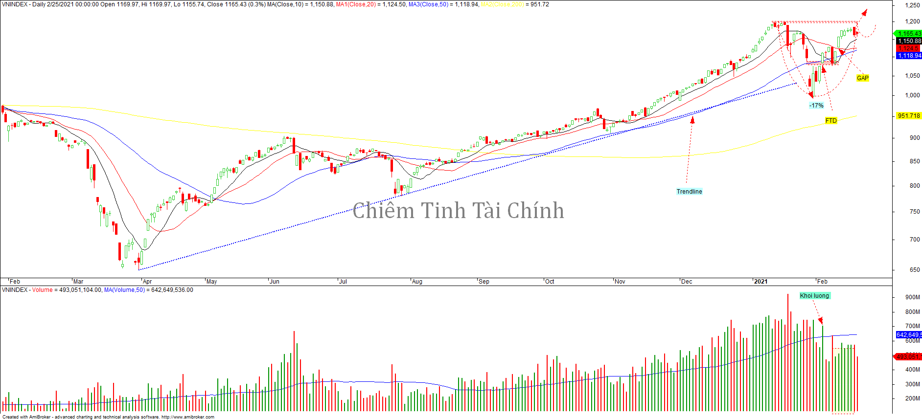 Hiện tại, Phiên phân phối ngày 8/2/2021 xuất hiện sau ngày thứ 3 của ngày bùng  nổ theo đà   cho thấy xác suất đến 80% ngày bùng nổ theo đà phiên 5/2/2021 có thể bị thất bại. Chúng tôi vẫn đang tiếp tục theo dõi thị trường  ở những nhóm cổ phiếu dẫn dắt như: Công nghệ thông tin, ngân hàng, bất động sản, khu công nhiệp hạ tầng, và nhóm cổ phiếu tăng trưởng. Cổ phiếu thuộc những nhóm này đang đóng cửa trên đường MA50 ngày, thậm chí một số cổ phiếu liên tục thiết lập đỉnh giá mới như: FPT,PDR,HU4,SJS, DGC,REE… Như vậy có thể thấy trong một nhóm ngành sẽ phân hóa mạnh, có thể lấy nhóm ngành ngân hàng làm ví dụ những cổ phiếu đóng cửa dưới MA50 ngày đang cho xu hướng giảm như BID, CTG, VCB,ACB... Còn những cổ phiếu vẫn giữ được MA50 ngày vẫn đang tích lũy khá tốt và đang tiến gần điểm Break out như: VPB,VIB,TCB,TPB…