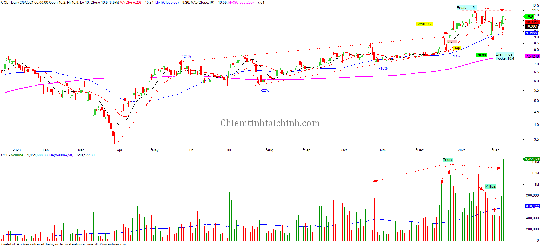 Cổ phiếu CCL, đang tiến gần điểm Break vùng 11.5 . Phiên 9/2/2021 cổ phiếu CCL đã có điểm mua Pocket sớm trước điểm Pivot ở vùng 10.4, khối lượng phiên hôm nay tăng mạnh gấp đôi trung bình 50 phiên.