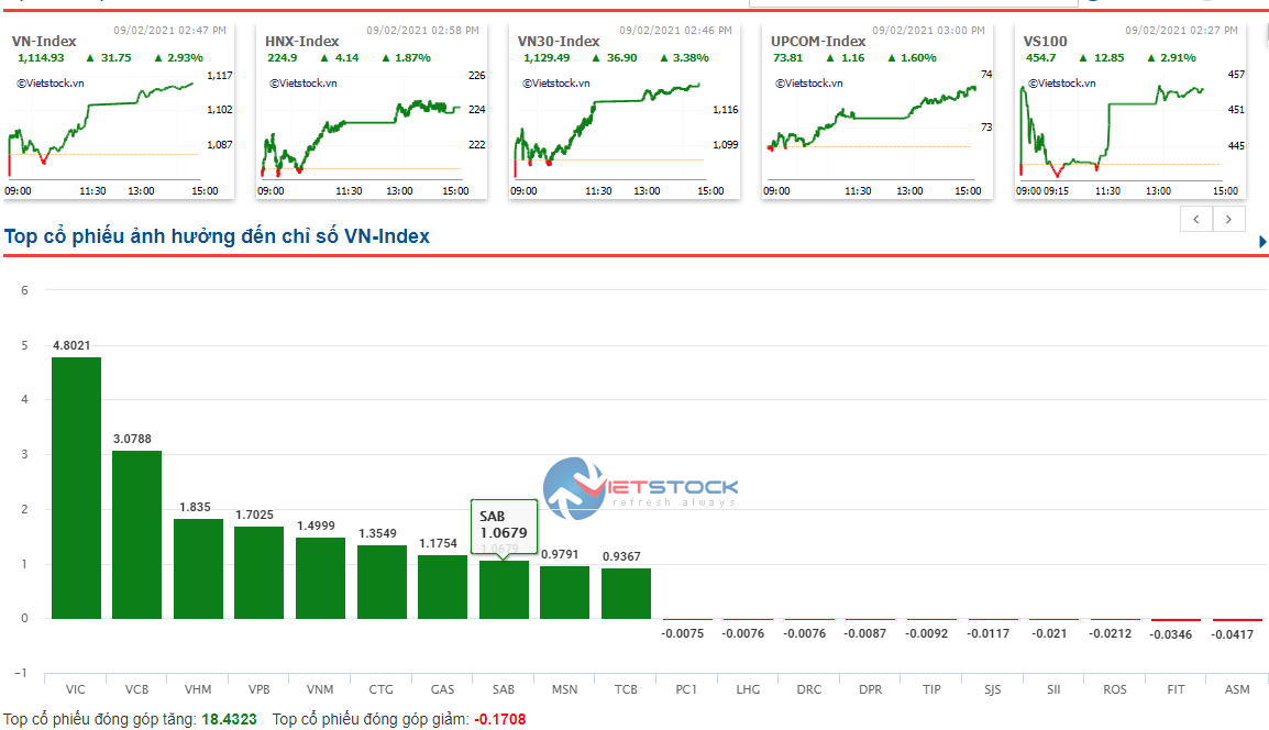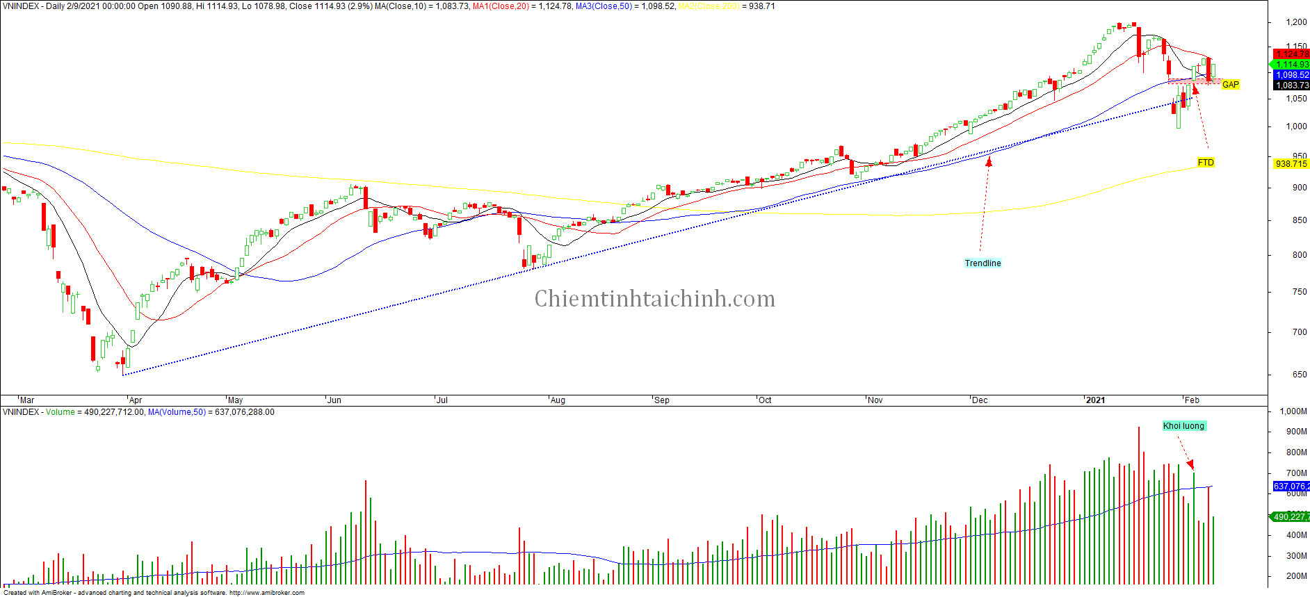 Kết thúc phiên giao dịch ngày 9/2/2021, chỉ số VNIndex đóng cửa ở mức 1114.93 điểm, tăng 31.75 điểm tương ứng với mức tăng 2.93%. Thanh khoản thị trường đạt hơn 490 triệu đơn vị, thấp hơn phiên ngày 8/2/2021. Thị trường tăng hơn 30 điểm với sự góp sức của những cổ phiếu nhóm ngân hàng, Vin là chủ yếu như: VHM,VIC,VCB,VPB,TCB… Trong phiên hôm nay chứng kiến nhiều cổ phiếu thiết lập đỉnh mới như :REE,FPT,PDR,DGW.... Đây là những cổ phiếu tăng trưởng có kết quả kinh doanh quý 4 năm 2020 và cả năm 2020 tăng trưởng. Nhóm ngành Bất động sản, khu công nghiệp hạ tầng, công nghệ thông tin và nhóm dầu khí cũng đang thu hút dòng tiền khá mạnh.