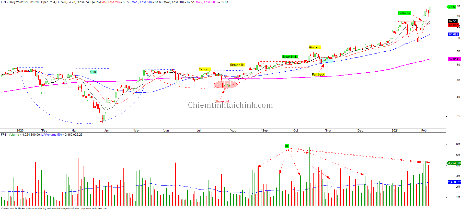 Cổ phiếu FPT thiết lập đỉnh giá mới với khối lượng tăng mạnh. Xu hướng tăng của FPT vẫn đang tiếp diễn. Hiện tại FPT chưa có điểm gia tăng, giá đang cắt khá xa MA 10 ngày. Nhóm ngành công nghệ thông tin đang có sóng ngành với những cổ phiếu tăng điểm trong nhóm ngành như: FOX,CTR,VGI….