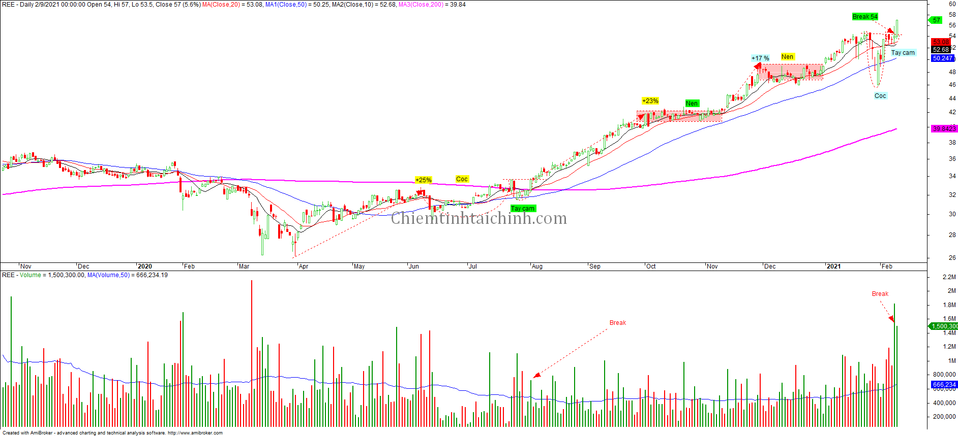 Cổ phiếu REE thiết lập đỉnh giá mới lên vùng 57 đi kèm khối lượng tăng mạnh trên bình quân 50 phiên. REE xuất hiện điểm mua Pocket trong nền giá ở vùng 53 phiên ngày 8/2/2021.