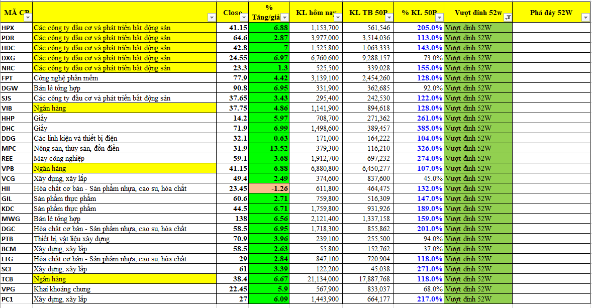 Theo thống kê của chúng tôi về danh sách cổ phiếu vượt đỉnh 52 tuần có nhóm ngành bất động sản, ngân hàng, bán lẻ…. và một số cổ phiếu tăng trưởng như: DGW,DGC,DHC,PTB... Đang bức phá mạnh và thu hút dòng tiền. Độ rộng của thị trường của thị trường tăng lên ủng hộ cho đà tăng của chỉ số.
