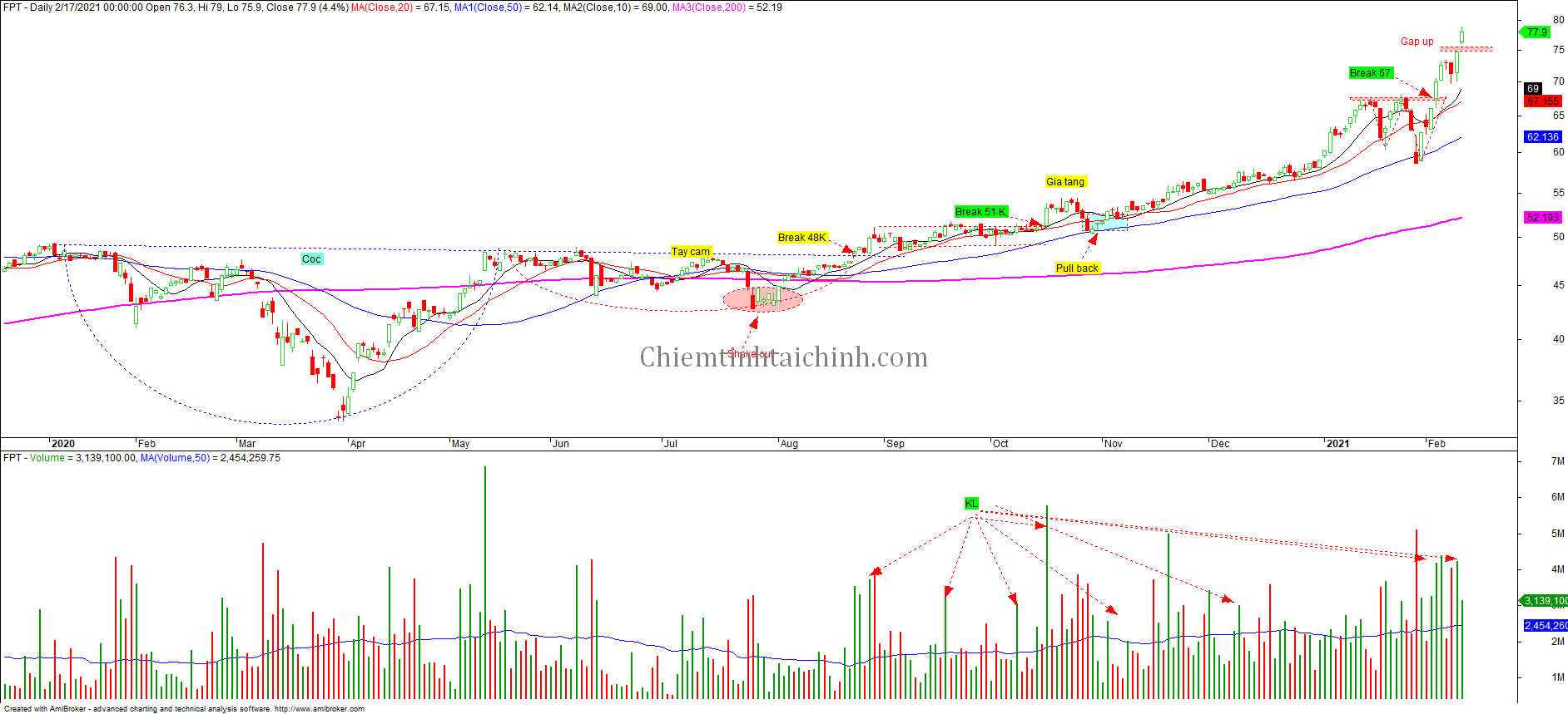 Cổ phiếu FPT mở Gap và thiết lập đỉnh giá mới cùng với sóng ngành ” Công nghệ thông tin”, cùng với chất xúc tác từ kết quả kinh doanh của FPT giúp cổ phiếu tiếp tục tăng điểm. Xem thêm về FPT: [Nhịp đập thị trường 3/2/2021] Phiên bùng nổ theo đà (FTD) và mẫu hình đảo chiều Island Gap xuất hiện, nhiều cổ phiếu thiết lập đỉnh giá mới – Tiêu điểm FPT