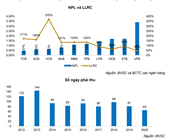 Quý 4/2020, tỷ lệ nợ xấu của TCB tiếp tục giảm và đạt 0.47%. Đây là mức thấp nhất trong lịch sử TCB và thấp nhất hệ thống. Sự cải thiện tỷ lệ NPL chủ yếu là nhờ khách hàng phục hồi khả năng thanh toán (TCB chỉ xóa bỏ nợ xấu 345 tỷ, là mức thấp hơn nhiều so với các quý trước đó) và do tín dụng tăng nhanh trong Quý 4. Tỷ lệ LLRC tăng lên 171%, đây cũng là mức cao nhất trong lịch sử của TCB và cao thứ 2 trong hệ thống (chỉ sau VCB). Tỷ lệ nợ xấu thấp và LLRC cao tạo ra nền tảng vững vàng cho TCB trong những năm tới. Đặc biệt hơn, Số ngày phải thu của TCB cũng đã có sự cải thiện đáng kể và đang dần tiến về mức trung bình trong hệ thống.
