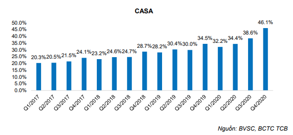 Quý 4/2020, Techcombank ghi nhận tỷ lệ CASA cao nhất từ trước tới nay là 46.1%, đây cũng là tỷ lệ CASA cao nhất trong hệ thống. Techcombank là người đi đầu và đã thành công trong việc thu hút CASA từ khách hàng cá nhân nhờ chính sách như miễn phí chuyển khoản, tặng tiền khi chi tiêu, gia tăng trải nghiệm trên ứng dựng… Giữa năm 2020, Techcombank tiếp tục là ngân hàng tiên phong cung cấp giải pháp toàn diện và miễn phí cho khách hàng doanh nghiệp với các dịch vụ tiên phong. Nhờ chính sách mới này, Quý 4/2020, CASA từ nhóm khách hàng doanh nghiệp đã tăng tới 44.4% QoQ (52.9% YTD). Đây là động lực mới giúp cho CASA của Techcombank tiếp tục bứt phá mạnh mẽ trong Quý 4 mặc dù đã ở mức rất cao. Với văn hóa liên tục đổi mới sáng tạo, liên tục đưa ra các sản phẩm và giải pháp mới để gia tăng trải nghiệm khách hàng thì chúng tôi cho rằng TCB sẽ tiếp tục duy trì vị trí dẫn đầu về tỷ lệ CASA.