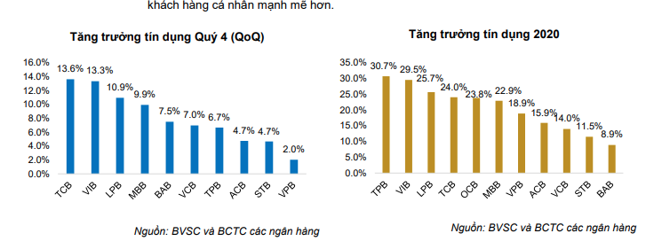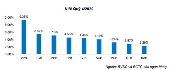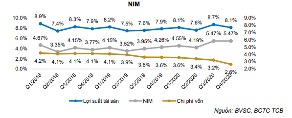 NIM mở rộng mạnh mẽ Quý 4/2020, NIM của TCB đạt 5.47%, tương đương với NIM Quý 3 và tăng 122 bps so với cùng kỳ. Lợi suất sinh lợi trên tài sản của TCB có sự sụt giảm nhẹ so với với Quý 3 do áp dụng lãi suất ưu đãi của các khoản vay mới, lãi suất huy động giảm cũng như hạ lãi suất hỗ trợ khách hàng. Tuy nhiên, NIM quý 4 của TCB vẫn tương đương với Quý 3 và là mức cao nhất trong 3 năm gần đây nhờ chi phí vốn giảm mạnh. Chi phí vốn của TCB giảm nhờ lãi suất huy động giảm và CASA tăng mạnh. Năm 2021, BVSC đánh giá NIM của TCB có thể sẽ giảm 19 bps về mức 4.55% do TCB có thể hạ lãi suất để hỗ trợ khách hàng, TCB tăng giải ngân cho vay mua căn hộ mà lãi suất ưu đãi khá thấp trong một vài năm đầu cũng như tỷ trọng cho vay khối khách hàng doanh nghiệp lớn tăng.