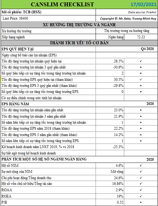 Bảng Canslim checklist của TCB đạt khá nhiều tiêu chí như: Nguồn vốn vững mạnh, Lợi nhuận trên vốn chủ sở hữu (ROE) và trên tổng tài sản (ROA), Hệ số NIM….