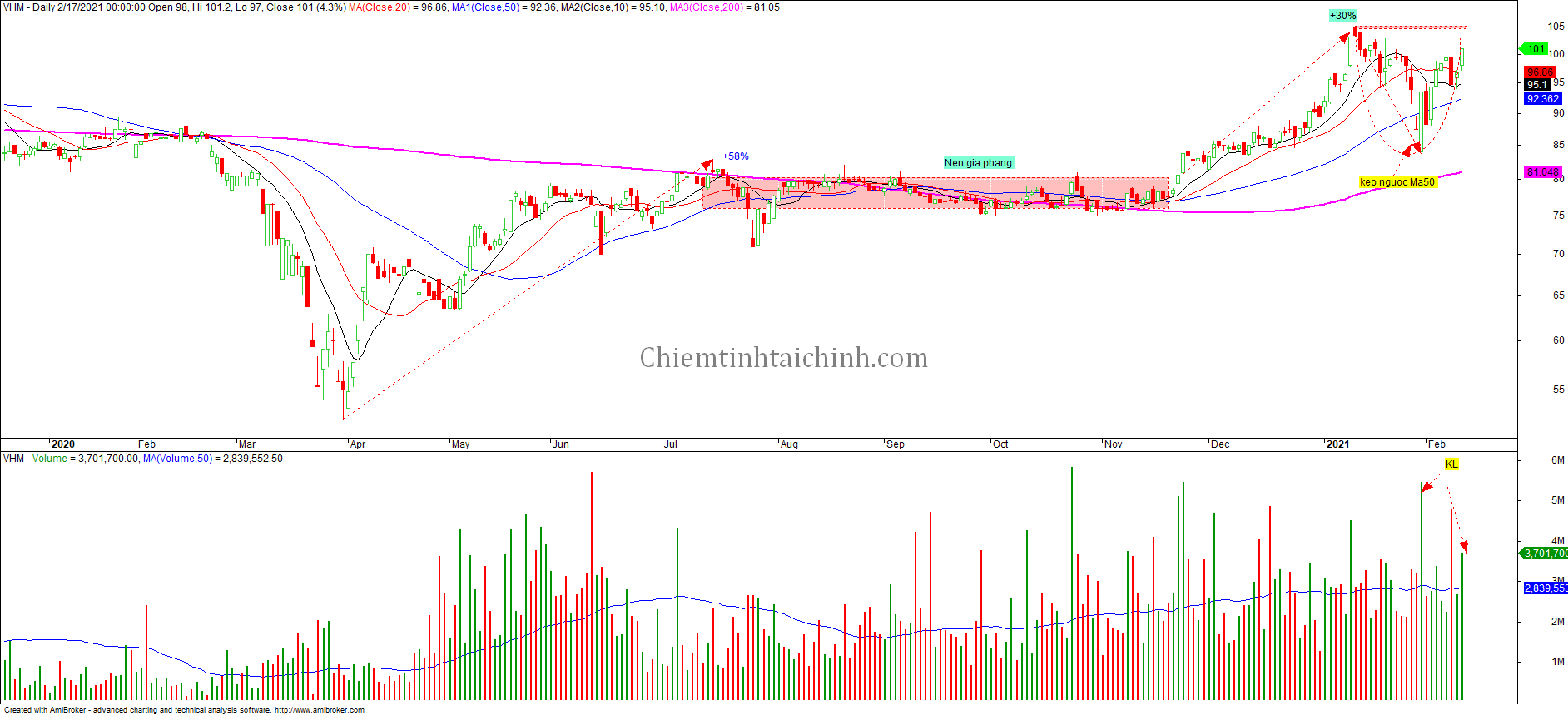 Cổ phiếu đang tiến về vùng 105 của mẫu hình cốc tay cầm, phiên giap dịch ngày 17/2/2021 dòng tiền đổ bộ vào cổ phiếu VHM với khối lượng tăng mạnh trên bình quân 50 phiên. Đạt mức hơn 3.7 triệu đơn vị. Nhóm ngành bất động sản đang có sóng ngành cùng các cổ phiếu khác như: DXG,PDR,HDC,CCL….