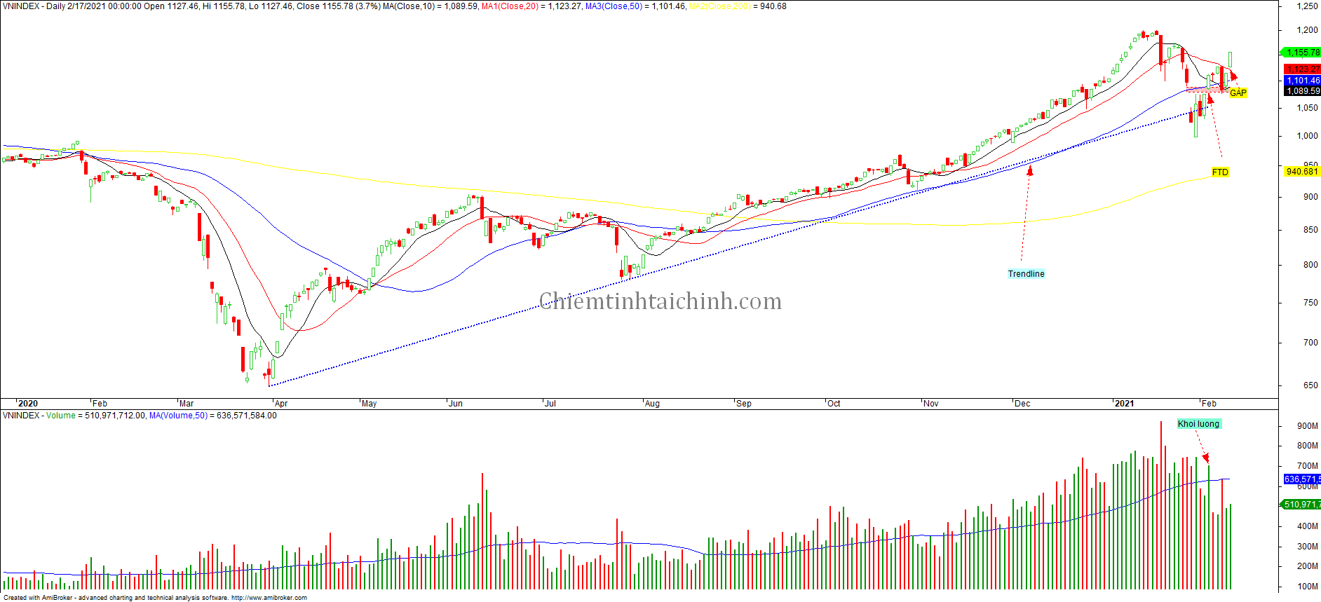 Kết thúc phiên giao dịch ngày 17/2/2021, chỉ số VNIndex đóng cửa ở mức 1155.78 điểm, tăng 40.85 điểm tương ứng tăng 3.66 %. Thanh khoản thị trường đạt hơn 510 triệu đơn vị, khối lượng phiên hôm nay cao hơn phiên 9/2/2021. Thị trường tăng điểm từ lúc mở của phiên giao dịch “Tân Sửu” với sự bùng nổ mạnh tư các nhóm ngành như: Bất động sản, khu công nghiệp hạ tầng, ngân hàng, công nghệ thông tin, dầu khí. Cổ phiếu ngành ngân hàng đóng góp nhiều vào mức tăng điểm phiên hôm nay như: VCB, TCB,CTG, BID….. Số lượng cổ phiếu tăng điểm áp đảo số lượng cổ phiếu giảm điểm . Đà tăng của thị trường được duy trì và bùng nổ mạnh vào phiên chiều.