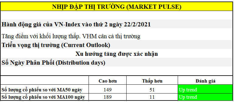 Xu hướng thị trường vẫn đang ở “XU HƯỚNG TĂNG ĐƯỢC XÁC NHẬN” và chưa có phiên phân phối nào. Phiên phân phối ngày 8/2/2021 đã được xóa khi chỉ số tăng cao hơn 5% so với giá đóng của ngày phân phối này. Nhóm ngành ngân hàng,thép, bất động sản, khu công nghiệp hạ tầng bất động sản, dầu khí, công nghệ thông tin đang có sóng ngành. Số lượng cổ phiếu trên bình quân 50 phiên vẫn cao hơn số lượng cổ phiếu dưới bình quân 50 phiên cho thấy thị trường vẫn đang xu hướng tăng.