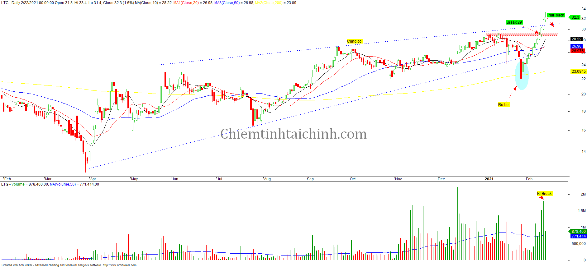 Như đã cập nhật phân tích về cổ phiếu LTG ở bài viết: [Nhịp đập thị trường 8/2/2021] Thị trường “Lật mặt”, cảnh báo “Xu hướng tăng của thị trường” – Tiêu điểm LTG Cổ phiếu LTG đã break vùng 29 vùng đỉnh tháng 1 năm 2021 và vùng 31 của vùng củng cố, tuy nhiên đà tăng của LTG đang khá nóng. Hành động giá cách đang cách 15% só với đường MA10 ngày cho thấy cổ phiếu LTG có thể sẽ bị kéo ngược về vùng 30 -31.