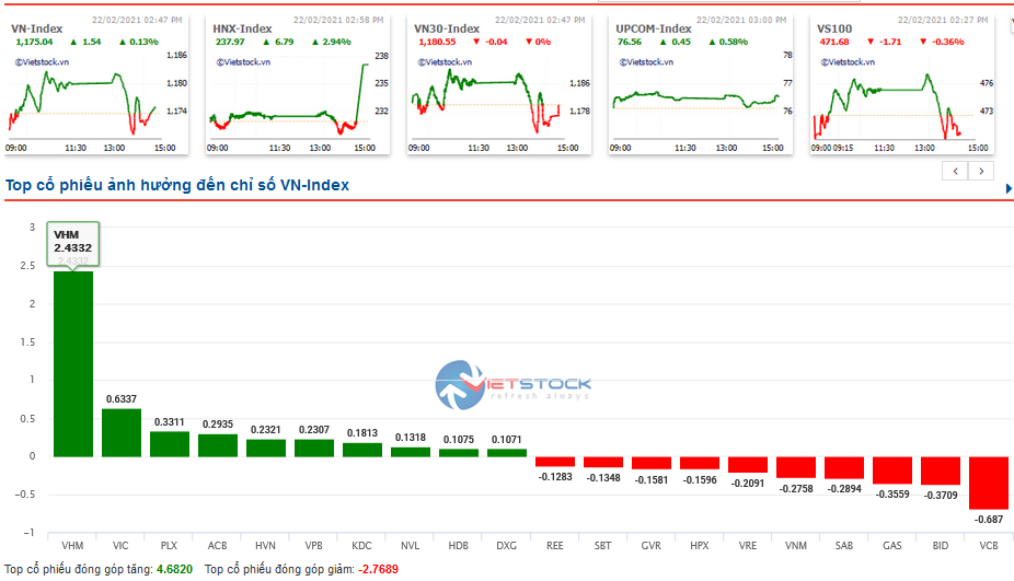 Kết thúc phiên giao dịch ngày 22/2/2021, chỉ số VNIndex đóng cửa ở mức 1175.04 điểm, tăng 1.54 điểm tương ứng với mức tăng 0.13 %.Thanh khoản thị trường đạt hơn 571 triệu đơn vị, cao hơn phiên ngày 19/02/2021. Nhóm ngành ngân hàng và VIN vẫn là tâm điểm của dòng tiền. Cổ phiếu dòng VIN nổi bật với VHM và VIC đã giúp thị trường tăng điểm nhẹ vào cuối phiên. Áp lực bán mạnh bắt đầu từ phiên chiều nhiều cổ phiếu “Sáng xanh chiều đỏ” đã làm thị trường có lúc đỏ nhẹ vào phiên chiều. Nhóm ngành ngân hàng vẫn đang hỗ trợ thị trường trong khi nhóm này cũng đang tăng giảm trái chiều. Nhóm ngành dầu khí và nhóm đường đang được hưởng lợi khi giá đường tăng cao nhất 4 năm và giá dầu khi liên tục thiết lập đỉnh giá mới đã làm 2 nhóm cổ phiếu này tăng điểm vào phiên nay nổi bật: PVD, PVS, QNS….
