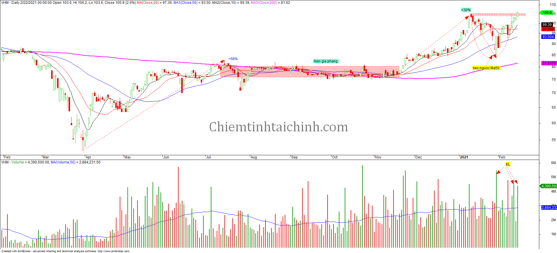 Cổ phiếu VHM đã break vùng đỉnh củ tháng 1/ 2021 ở vùng 105 với khối lượng tăng mạnh trên bình quân 50 phiên. Tuy nhiên với mức điều chỉnh gần 20% khi kéo ngược MA50 ngày, khả năng cao VHM sẽ tích lũy vùng 105 trước khi tiếp tục xu hướng tăng. Hiện tại nhóm ngành bất động sản đang có sóng ngành và cổ phiếu VHM đang là cổ phiếu dẫn dắt và có ưu thế rất lớn về quỹ đất cũng như thương hiệu Vinhomes sẽ giúp VHM tiếp tục có chất xúc tác tăng điểm trong thời gian tới. Xem thêm vài nét về VHM : [Nhịp đập thị trường 1/2/2021] Ngày nỗ lực hồi phục thứ 2, thị trường phân hóa mạnh- Tiêu điểm cổ phiếu VHM
