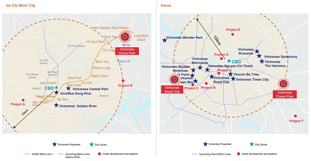 Vị trí 3 đại dự án trọng điểm hiện tại của Vinhomes tương quan với quy hoạch phát triển hệ thống giao thông. Nguồn: Vinhomes