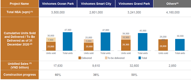Với Vinhomes Grand Park (quận 9, TP HCM), tiến độ xây dựng hoàn thành 50% toàn bộ dự án. Tổng sản phẩm đã bán là 39,300 (bao gồm 28,3000 sản phẩm đã bàn giao và 10,900 sản phẩm sắp bàn giao), chiếm tỷ trọng 86% toàn dự án. Doanh số bán hàng chưa ghi nhận là 32,600 tỷ đồng.