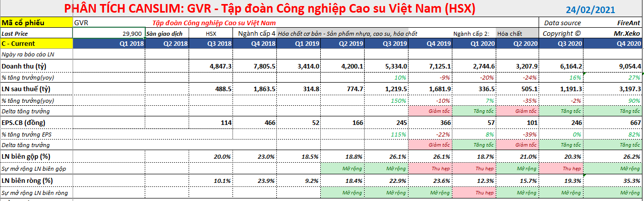 Cổ phiếu GVR đang có Code 33 của phù thủy Mark Minervini trong đó cổ phiếu đã có 3 quý tăng trưởng doanh thu, lợi nhuận và sự mở rộng của biên lợi nhuận. Biên lợi nhuận gộp quý 4 năm 2020 đạt 26.2%, đây là mức biên lợi nhuận khá cao. Lưu ý theo tìm hiểu quý 4 năm 2020 biên lợi nhuận của GVR tăng cao là thoái thành công gần 9.34 triệu cổ phiếu Đầu tư Sài Gòn VRG (SIP), GVR sẽ thu về khoảng 1,317.9 – 1,321.6 tỷ đồng. Mật mã 33 được phù thủy Mark Minervini đề cập đến trong cuốn sách “Giao Dịch Như Một Phù Thủy Chứng Khoán”