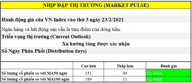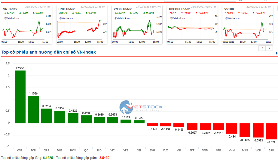 Kết thúc phiên giao dịch ngày 23/2/2021, chỉ số VNIndex đóng cửa ở mức 177.64 điểm, tăng 2.6 điểm tương ứng tăng 0.22%. Thanh khoản thị đạt hơn 572 triệu đơn vị và cao hơn phiên 22/02/2021. Nhóm ngành ngân hàng, VIN, khu công nghiệp hạ tầng vẫn đang là tâm điểm của thị trường. Tuy nhiên nhóm ngành ngân hàng tăng giảm trái chiều, nhóm này đang luân phiên giúp chỉ số VNIndex tiếp tục tăng điểm.