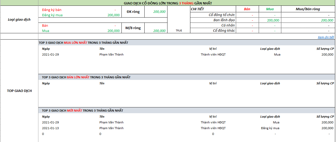 Giao dịch cổ đông lớn trong 3 tháng gần nhất : Cổ đông lớn Phạm Văn Thành mua vào 200,000 cổ phiếu.