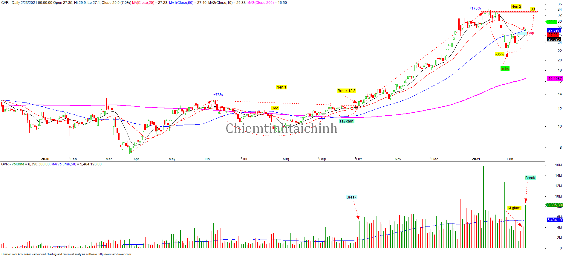 Hành động giá của GVR phiên ngày 23/2/2021 đã lấy lại được cứ điểm MA50 ngày và đóng cửa cao nhất phiên. Thanh khoản tăng mạnh trên bình quân 50 phiên cho thấy dòng tiền đang quay trở lại GVR. Đây là điểm mua Pocket Pivot của môn đệ O’neil được trình bày trong cuốn sách “Cách kiếm lợi nhuận 18000%”