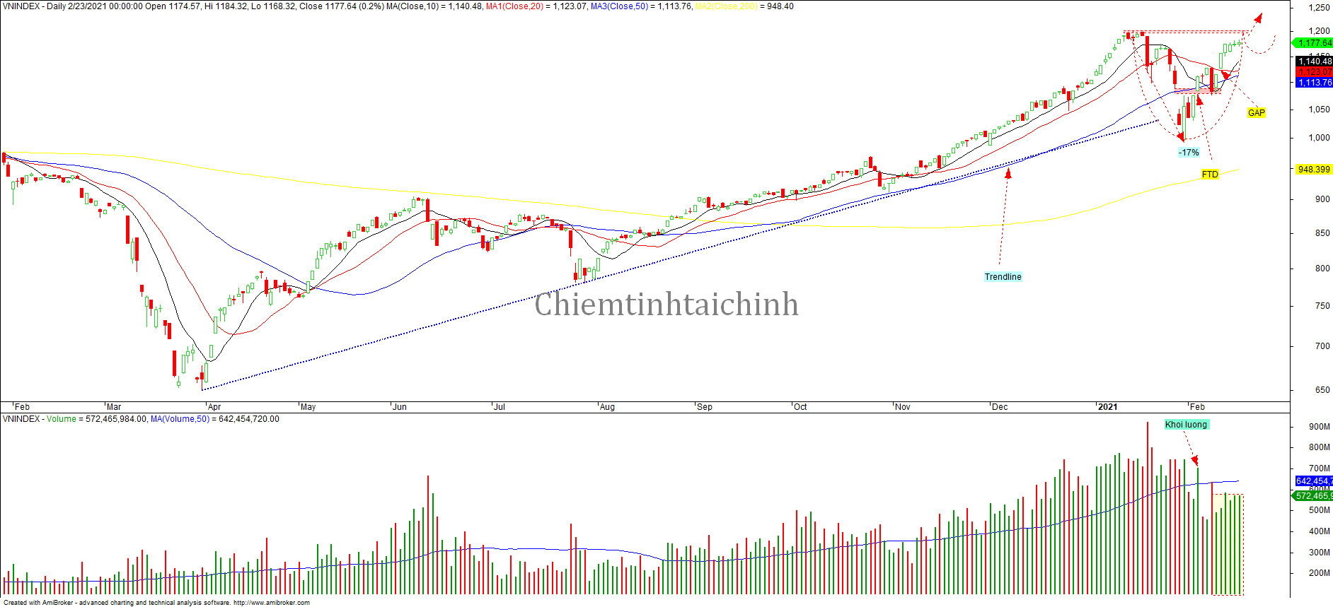 Với sự kỳ vọng quay trở lại của nhóm ngành chứng khoán chỉ số VNIndex như được “Hổ mọc thêm cánh” cũng không loại trừ kịch bản chỉ số VNIndex sẽ bức phá qua đỉnh 1200 điểm. Khối lượng giao dịch 10 phiên gần đây đều thấp hơn bình quân 50 phiên. Nếu thị trường đồng loạt đồng thuận tăng điểm và bùng nổ về khối lượng tăng mạnh thì chỉ số VNIndex sẽ vượt qua đỉnh 1200 điểm với sự trợ giúp của nhóm: Ngân hàng, chứng khoán, bất động sản, khu công nghiệp hạ tầng, công nghệ thông tin. Bên cạnh đó vẫn tiếp tục quan sát kịch bản khác là chỉ số VNIndex sẽ hình thành mẫu hình “Cốc tay cầm” trên đồ thị của VNIndex. Xem thêm bình luận về mẫu hình của chỉ số VNIndex: [Nhìn Lại Tuần Qua, 19/2/2021] Nhóm ngành ngân hàng vẫn dẫn dắt đầu tàu VNIndex giữ được xu hướng tăng