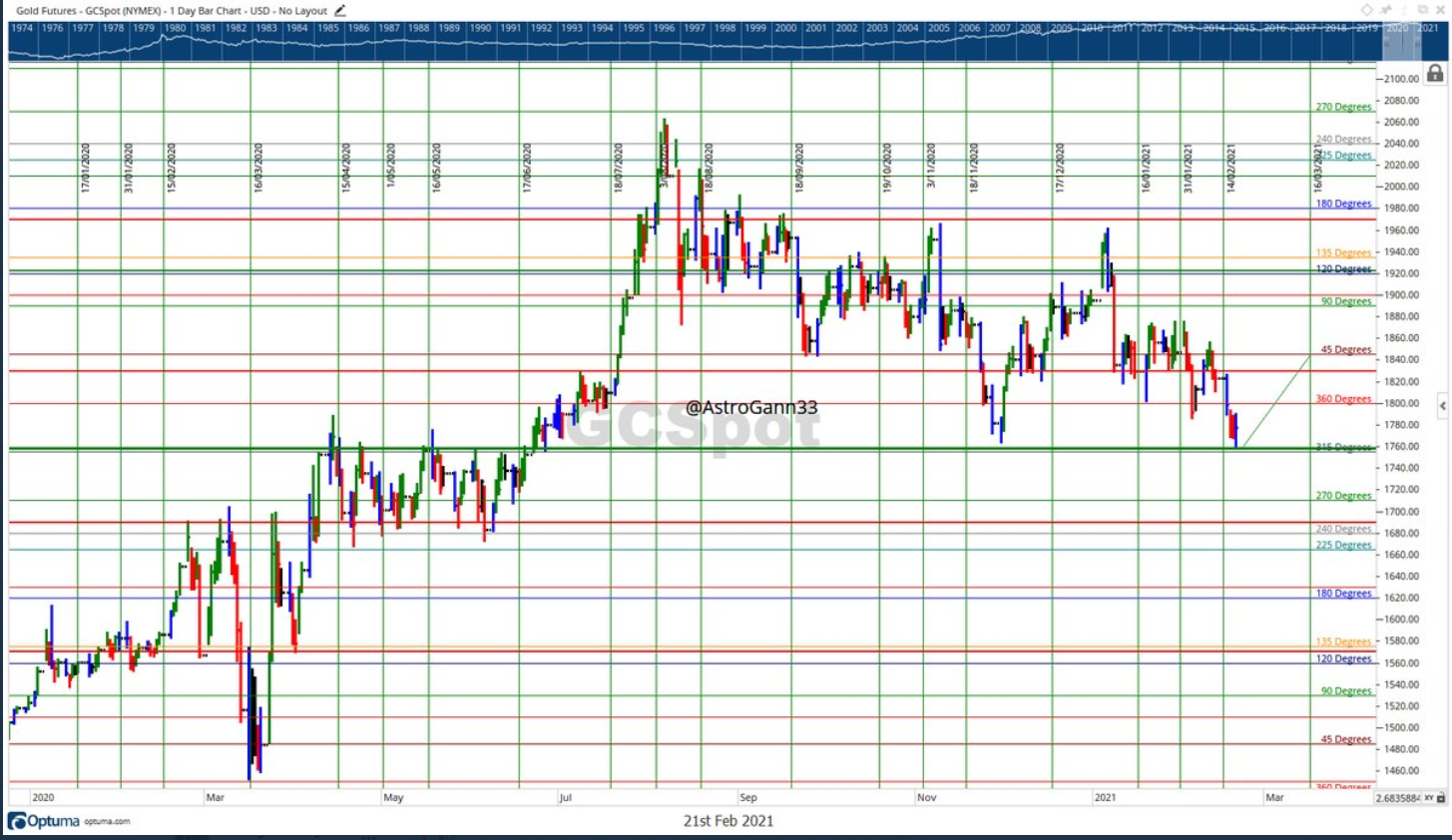 Trên Twitter cá nhân, bà Olga Moracles, nữ chiêm tinh tài chính ở Úc cho rằng, nếu giá vàng giữ mốc 1760, thì có thể bò từ từ lên 1845, có thể là vào mốc thời gian quanh ngày 16 tháng 3 năm 2021. Điều này dựa trên tính toán Gann Square of Nine. Bà nói, “tất nhiên tôi có thể sai, Gann nói rằng đáy cũng có thể trở thành đỉnh):