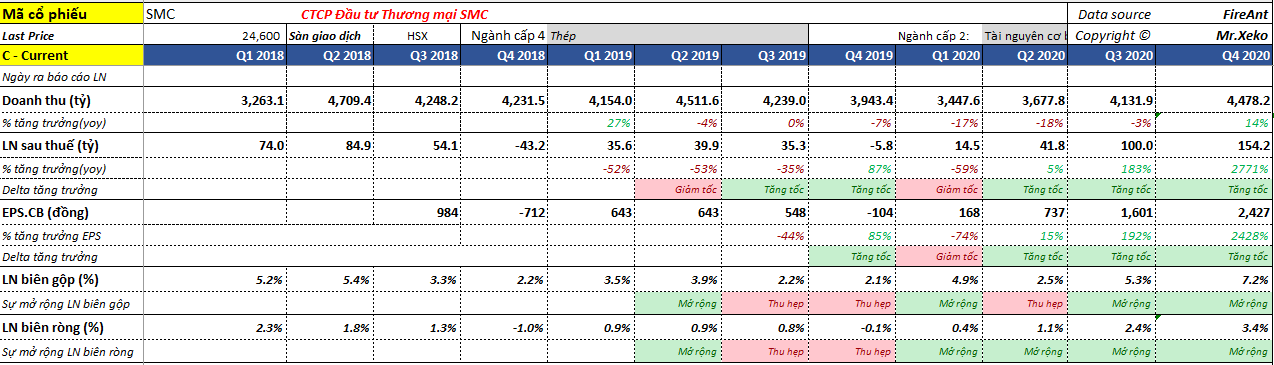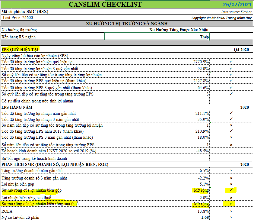 Bảng CANSLIM CHECKLIST quý 4 năm 2020, hầu như SMC đỗ các chỉ tiêu về tăng trưởng: Lợi nhuận, EPS . SMC hiện tại đang có sự mở rộng lợi nhuận gộp biên và lợi nhuận biên ròng sau thuế .