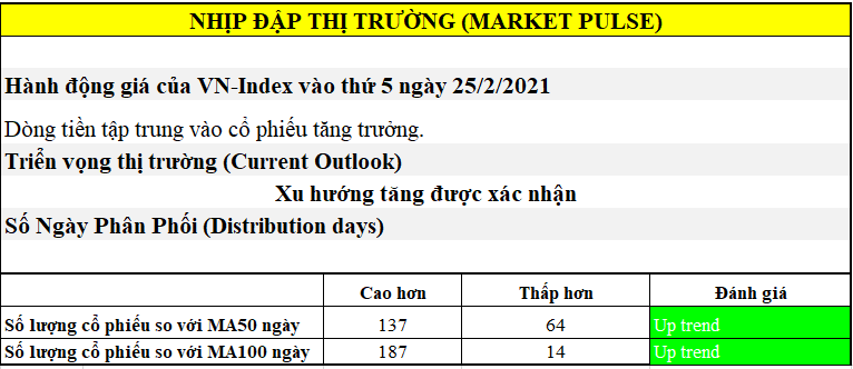 Xu hướng thị trường đang ở “XU HƯỚNG TĂNG ĐƯỢC XÁC NHẬN“. Số lượng cổ phiếu trên MA50 ngày vẫn đang áp đảo số lượng cổ phiếu dưới MA50 ngày . Như vậy xu hướng tăng của thị trường vẫn được duy trì. Ngoài ra, với mức tăng điểm phiên ngày hôm này đã xác nhận phiên ngày 24/2/2021 không phải là phiên phân phối. Dòng tiền vẫn đang tập trung vào các nhóm như: Ngân hàng, bất động sản, khu công nghiệp hạ tầng, chứng khoán, dầu khí, thép là chủ yếu.