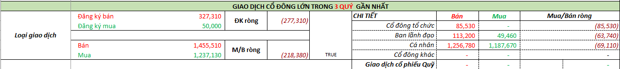Về giao dịch cổ đông lớn trong 3 quý gần nhất thì phần chênh lệch giữa mua và bán không cao. Bên bán ròng chỉ chênh 218,380 cổ phiếu so với bên mua.