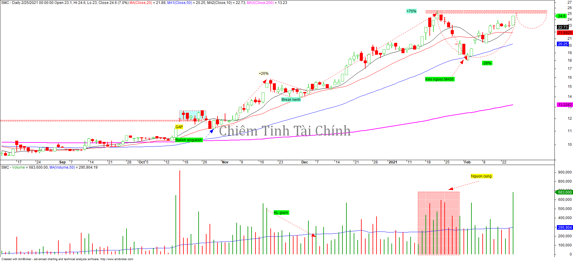 Khối lượng tăng mạnh phiên ngày 25/2/2021 tăng mạnh trên bình quân 50 phiên và gấp 3 lần khối lượng bình quân 50 phiên. Cho thấy dòng tiền đang quay trở lại cổ phiếu SMC. Quan sát nhóm ngành thép hiện tại dòng tiền đang quay trở lại và có sóng ngành với các cổ phiếu mạnh như: VGS,NKG,HPG,TLH,SMC…..