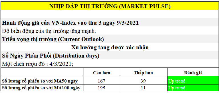 Ở góc độ ý kiến cá nhân, “tôi cho rằng thị trường đã có 3 phiên phân phối lần lượt các ngày : 4/3/2021, 8/3/2021 và 9/3/2021″. Phiên ngày 9/3/2021 tuy khối lượng thấp hơn phiên ngày 8/3/2021 nhưng độ biến động của thị trường ở mức cao, giảm đến 0.54%. Với nhiều nhóm cổ phiếu Bluchips đang hình thành xu hướng giảm giá như : VNM, SAB, VIC, VCB,MSN…. đã làm tôi thận trọng hơn về thị trường.