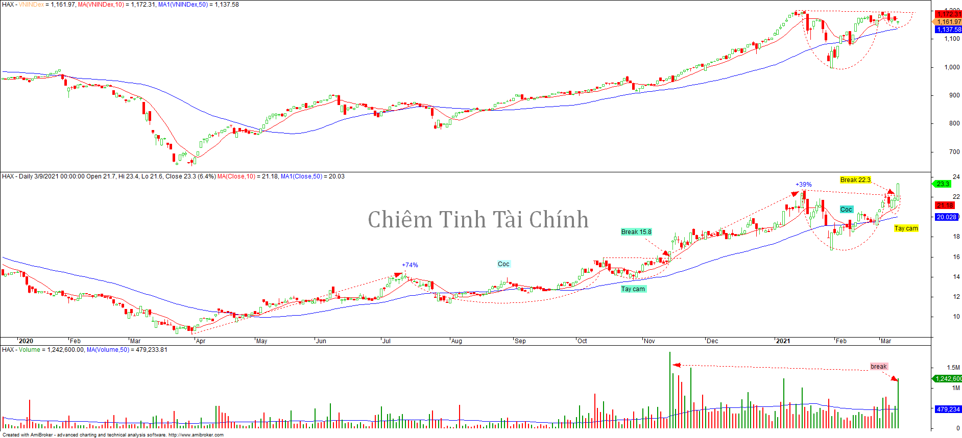 Cổ phiếu HAX đã Breakout mẫu hình cốc tay cầm với khối lượng lớn trên bình quân 50 phiên, có thể thấy đây là cổ phiếu mạnh so với thị trường chung. Trong bối cảnh chỉ số VNIndex vẫn chưa bức phá qua mốc 1200 điểm. Như tôi đã phân tích những yếu tố giúp HAX duy trì được “phong độ” vào quý 1 năm 2021. Cổ phiếu đã bứt phá, nguồn cung phía mạn trái chiếc cốc đã bị hấp thu hết bằng việc đẩy giá tăng mạnh phiên 9/3/2021. Xem bài viết trước : [Nhịp đập thị trường 2/3/2021] Ngân hàng thay phiên nhau giữ nhịp tăng của thị trường – Tiêu điểm HAX.