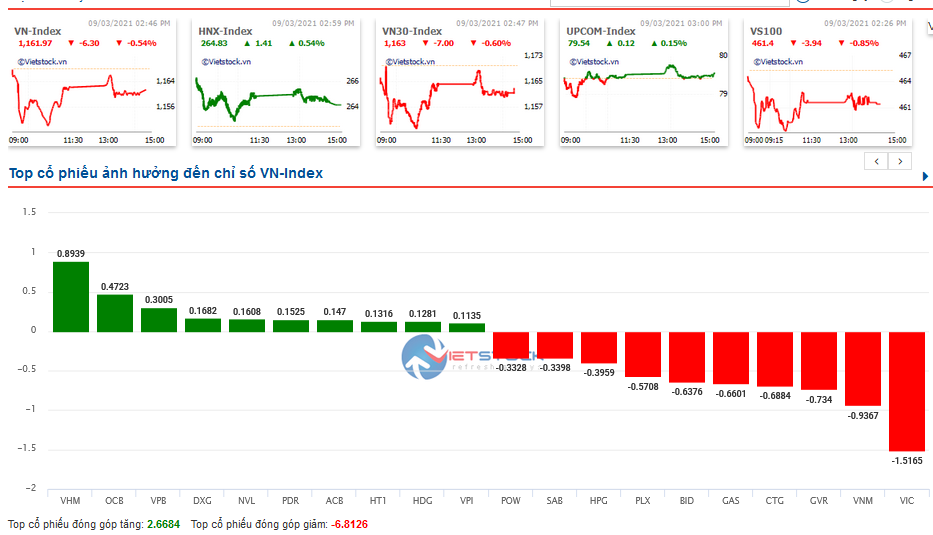 Kết thúc phiên giao dịch ngày 9/3/2021, chỉ số VNIndex đóng cửa ở mức 1,161.97 điểm, giảm 6.3 điểm, tương ứng mức giảm 0.54%. Thanh khoản thị trường đạt hơn 613 triệu đơn vị, thanh khoản phiên hôm nay thấp hơn phiên ngày 8/3/2021. Nhóm ngành ngân hàng, dầu khí tiếp tay cho đà giảm của thị trường. Độ rộng của thị trường đang dần tăng lên trong bối cảnh “ Khối ngoại liên tiếp bán ra”. Nhà đầu tư đang dần quen với việc chỉ giao dịch nửa phiên sáng và nửa phiên chiều là những điệp khúc, bài ca không quên ở các “diễn đàn, group “ xoay quanh vấn đề sàn Hose không nhận lệnh .