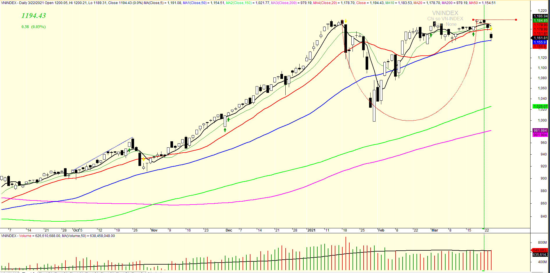 Hành động giá biến động mạnh MA20 ngày với khối lượng thấp cho thấy thị trường đang tăng dần về rủi ro, tiếp tục quan sát mẫu hình “Cốc tay cầm” trên chỉ số VNIndex. Nguồn cung đang được hấp thu một cách có trật tự, tuy nhiên độ biến động mạnh của thị trường cũng không loại trừ kịch bản chỉ số VNIndex sẽ kiểm tra vùng MA50 ngày tương ứng với vùng 1,137 điểm. Thậm chí đường xu hướng ở vùng 1,050 điểm.