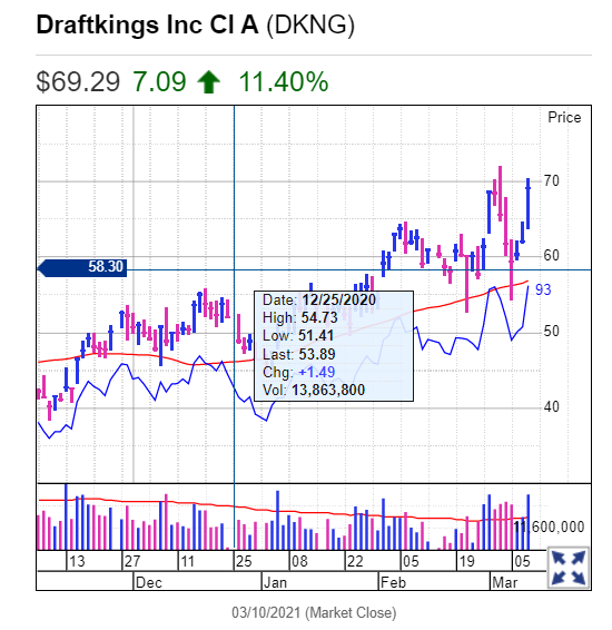 DraftKings đóng phiên chỉ còn cách đỉnh cao mọi thời đại 4% và đã có chuỗi tăng 3 ngày liên tiếp. Cổ phiếu này đã tăng 16% trong tuần này