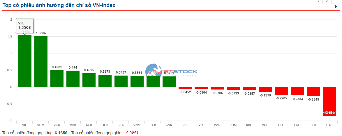 Nhóm ngành BĐS nổi sóng trở lại sau chuỗi ngày nghỉ ngơi khá dài nổi bật với một số cái tên như VHM (+1.73%), AGG (+2.63%), NDN(+9.9%). Trong khi đó dòng Ngân hàng cũng có một số mã tăng giá đến từ OCB, ACB và LPB, lần lượt là 5.2%, 2.2%, 1.6%. Cuối cùng cái tên không thể không nhắc đến trong ngày hôm nay đó là sóng ngành dầu khí với nổ lực hồi phục mạnh mẽ vào phiên đến từ các cái tên khá quen thuộc như BSR(+3.2%), OIL(+3.4%), .. đã giúp VN-Index có ngày tăng giá trở lại ấn tượng.