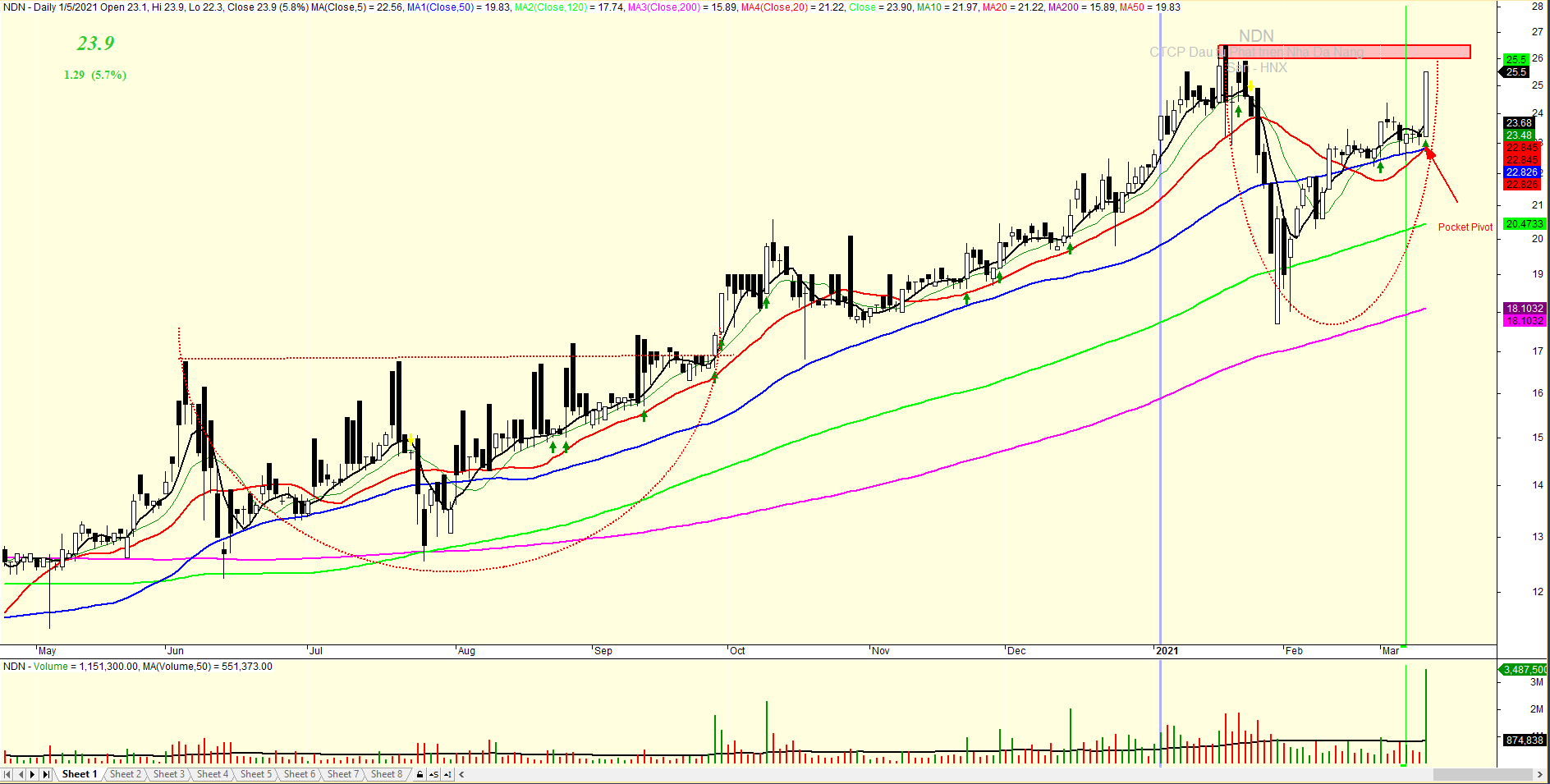 Theo hệ thống CANSLIM, NDN hôm nay có điểm mua Pocket Pivot – điểm mua sớm bên trong Mẫu hình CUP mà chúng tôi đang theo dõi. Hiện nay thời gian hình thành mẫu hình mới 6 tuần, chưa đủ thời gian hình thành theo lý thuyết là 7 tuần. Tuy nhiên, cần nhớ mẫu hình CUP giờ đây đã rộng và lỏng hơn so với mẫu hình Cup and handle hồi tháng 10.2020.