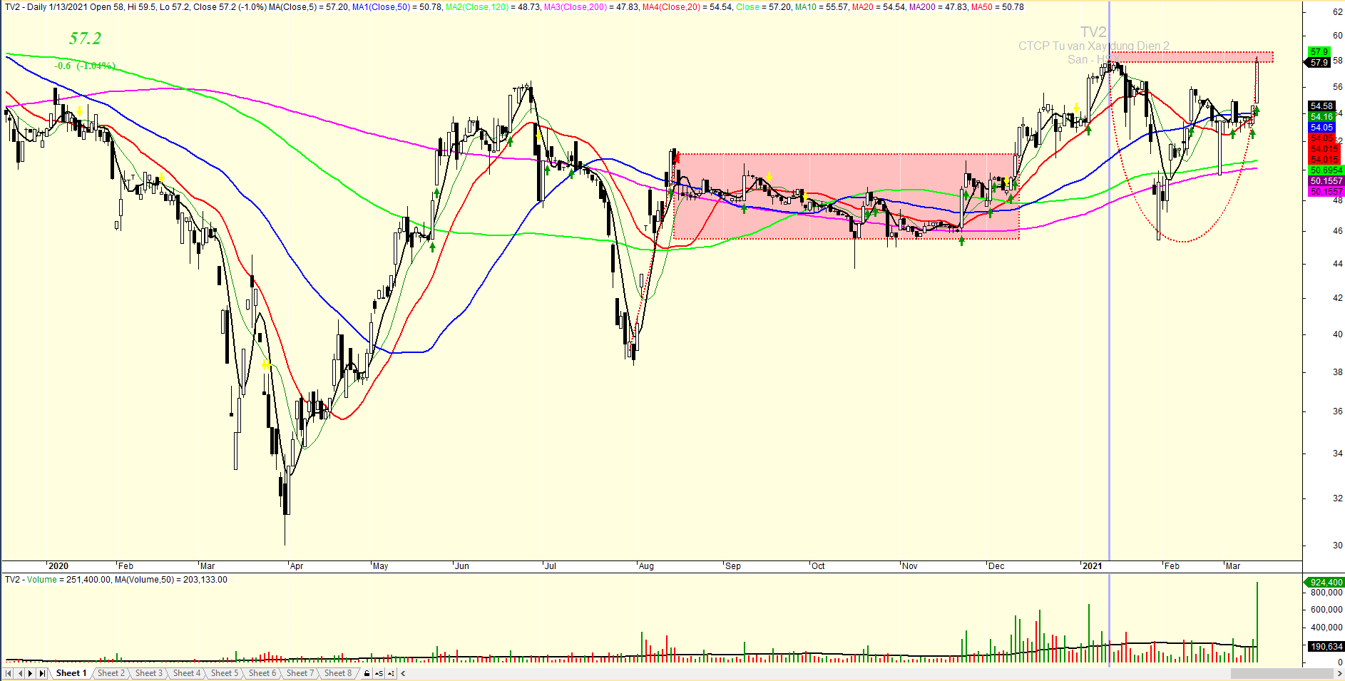 Theo hệ thống CANSLIM, TV2 hôm nay có điểm mua Pocket Pivot – điểm mua sớm bên trong Mẫu hình CUP. Thời gian hình thành mẫu hình là 7 tuần. Hiện tại TV2 đang ở nền giá số 1. Điểm pivot mẫu hình CUP là 59.5, chúng tôi sẽ mua bổ sung vị thế nếu TV2 breakout mẫu hình CUP vào ngày mai.