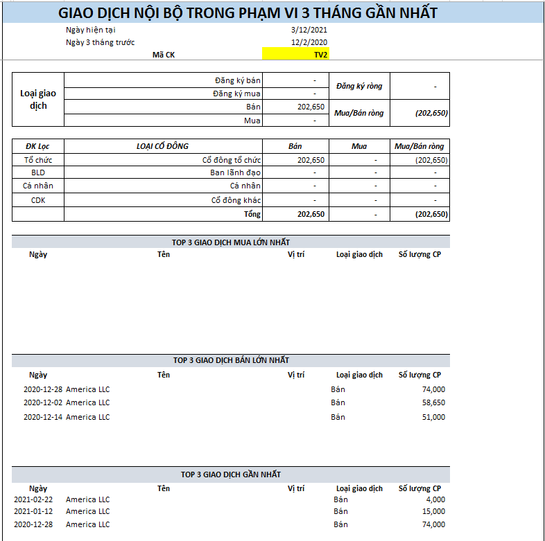 Lưu ý: trong tháng 12/2020 vừa qua, quỹ America LLC đã bán ra gần 200 ngàn cổ phiếu TV2.