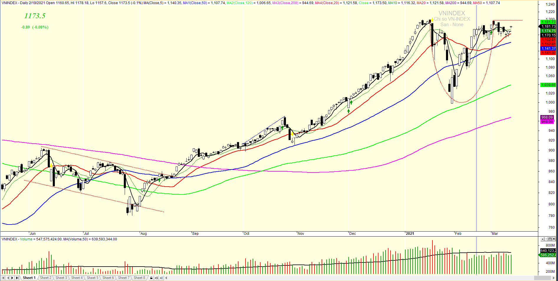 Chỉ số VN-index đang tiến tới khá gần điểm Pivot của mẫu hình Cốc tay cầm. Chỉ cần chỉ số Vn-index breakout vượt khỏi khu vực giá 1196.1 cùng với khối lượng lớn thì sẽ kích hoạt mạnh mẽ dòng tiền tham gia vào thị trường trong giai đoạn sắp tới. Nhưng một lần nữa, chúng tôi nhắc nhở trader tỉnh táo hơn bởi mẫu hình này đã trở nên rộng và lỏng hơn so với mẫu hình W hồi tháng 6-7 năm ngoái.