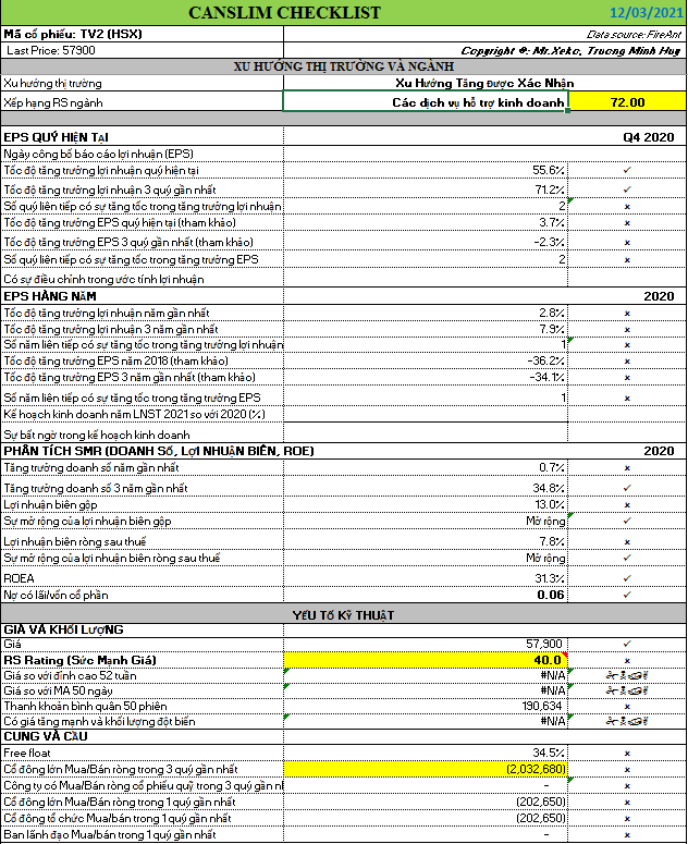 Quý 4/2020 LNST đạt 116.5 tỷ đồng, tăng 58% so với cùng kỳ năm trước. Lũy kế cả năm 2020, TV2 ghi nhận doanh thu 3,346 tỷ đồng, lợi nhuận đạt 262 tỷ đồng chỉ bằng xấp xỉ so với năm 2019. -> Trong mô hình CANSLIM chúng tôi quan trọng tiêu chí chữ C hơn là chữ A.