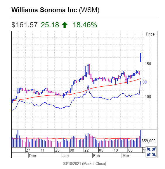 Danh sách IBD Stock Of The Day, Williams-Sonoma, đã có Breakaway Gap vượt qua điểm mua 151.26 của mẫu hình CUP sau khi có kết quả kinh doanh quý 4 mạnh mẽ. Lợi nhuận của công ty tăng vọt 85% lên mức $3.95/cổ phiếu. Doanh số tăng vọt 24% lên mức 2.29 triệu đôla, là quý thứ ba liên tiếp có sự tăng tốc trong tăng trưởng.