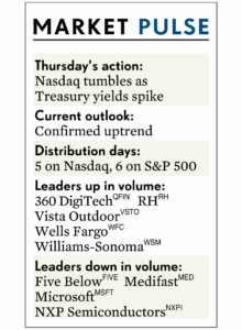 Thị trường chứng khoán bị bán tháo vào ngày thứ năm khi lợi suất trái phiếu chính phủ tăng vọt lên đỉnh cao 14 tháng. Chỉ số DJIA đã thiết lập đỉnh cao mới trước khi đảo chiều giảm điểm, trong khi chỉ số Nasdaq (có trọng số lớn ở nhóm cổ phiếu Tech) tiếp tục chìm sâu. Cổ phiếu Nike rớt khi có kết quả kinh doanh không rõ ràng sau khi đóng cửa phiên giao dịch.