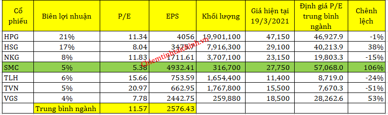 Sau khi đã lọc lại những cổ phiếu có thanh khoản thấp và giá giao dịch dưới 10. Thì tính trung bình P/E của ngành thép đạt tầm 11.57, với mức EPS của SMC đạt 4,932.41 thì giá của SMC phải ở mức 57 tức rẽ hơn 106% só với kết phiên ngày 19/3/2021. Cũng theo cách tính này hiện tại thì ngoài SMC còn có những cổ phiếu như HSG, VGS đang được thị trường định giá thấp hơn so với phiên đóng cửa ngày 19/3/2021. Chi tiết ở bảng bên dưới: